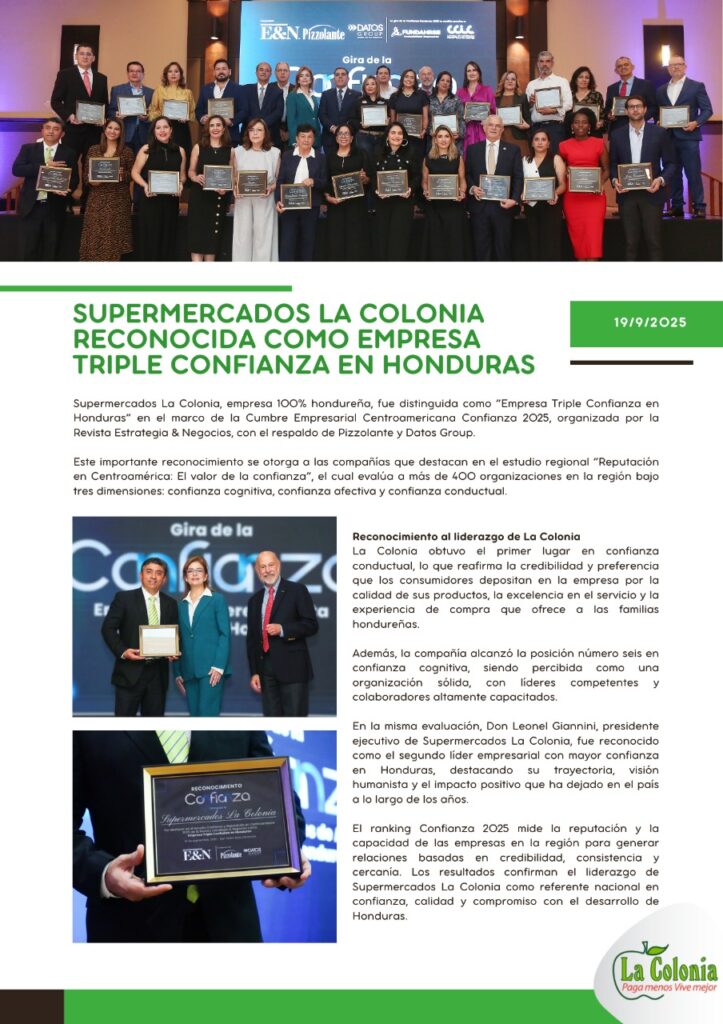 En el marco de nuestro 50 aniversario, en Supermercados La Colonia celebramos un nuevo hito: ser reconocidos como Empresa Triple Confianza en Honduras, distinción otorgada por la revista Estrategia & Negocios en su estudio “Reputación en Centroamérica: El Valor de la Confianza”.